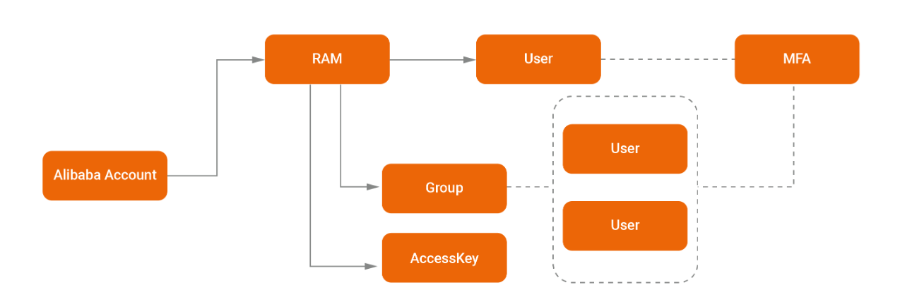 訪問控制 (Resource Access Management,RAM) 是阿里雲上身份管理與權限設置的服務,可以在阿里雲帳號下配置許多不同的身份用戶及群組,方便進行管理或是群組分配,實現不同用戶或是群組能擁有不同資源的訪問。訪問控制能夠安全管理人員及應用程式在阿里雲服務和資源的訪問權限,創建子用戶和用戶組,透過設定權限管控雲上資源的訪問,精細的訪問控制,只需要透過簡單的配置,也能跨帳號授權資源,將A帳號部分資源授權給B帳號管理。