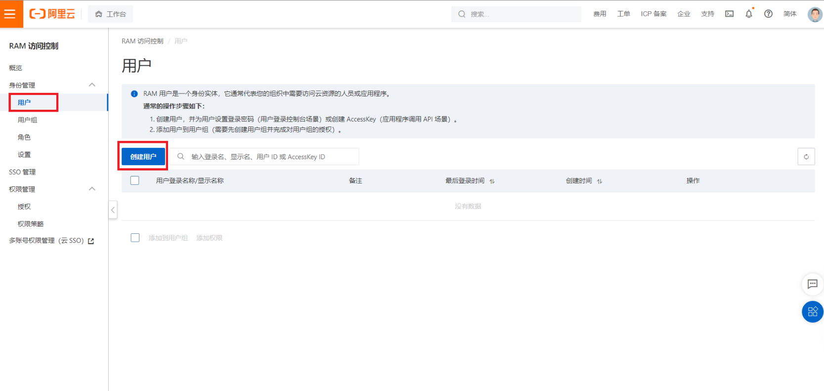 - 用戶組(RAM user group):一種管理各RAM用戶的分類,可以先對用戶組進行權限設定,再將RAM用戶分類管理。