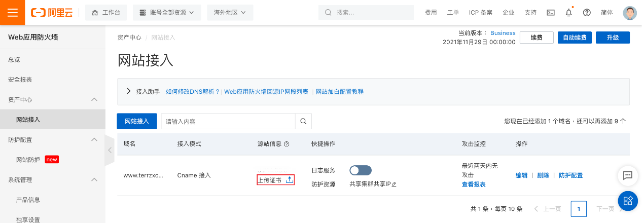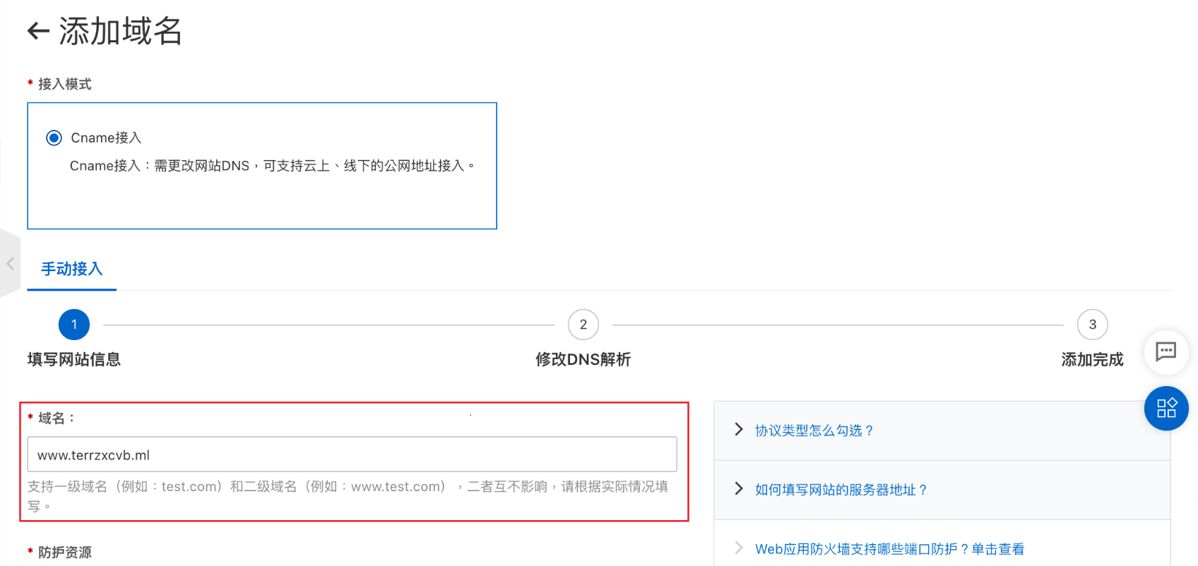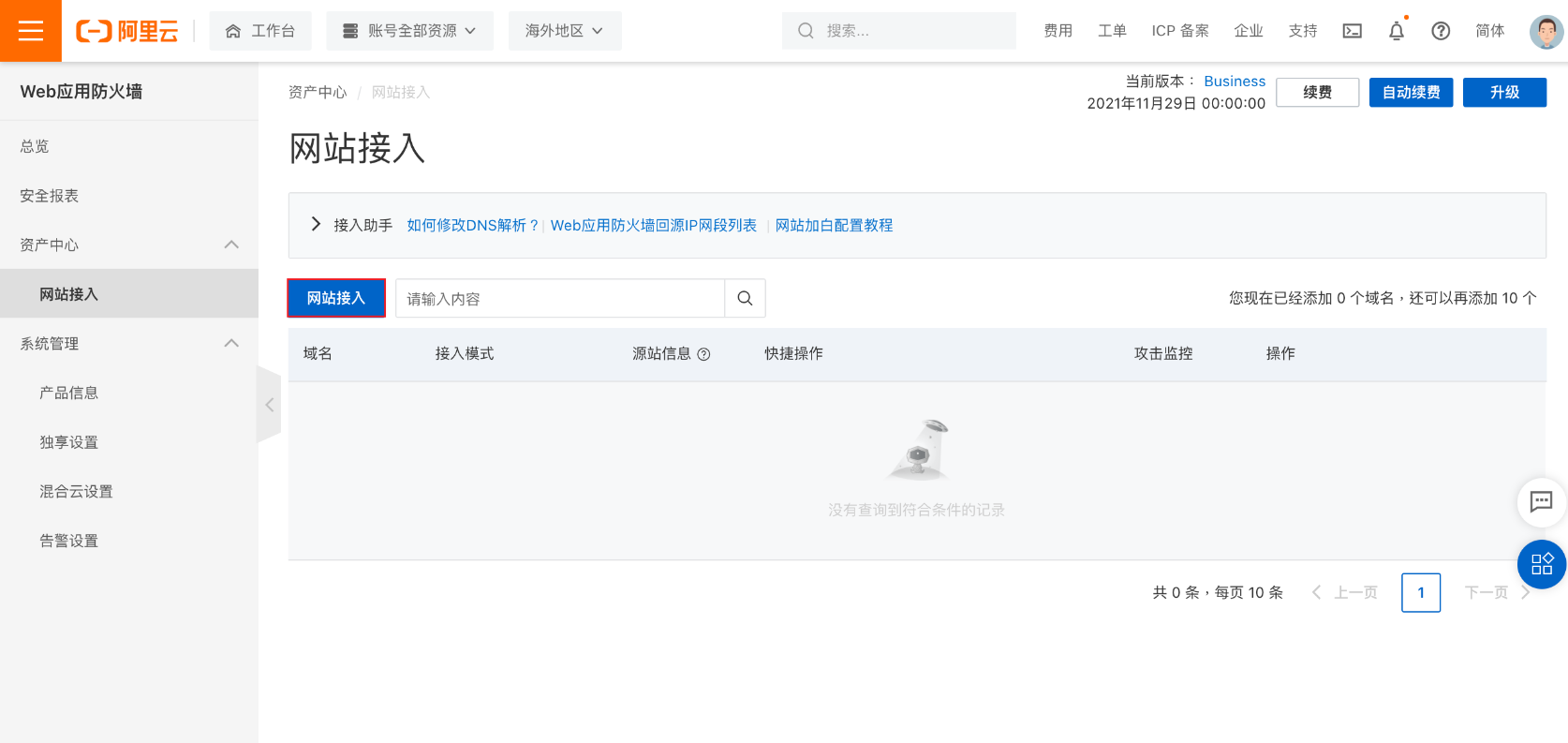 (1) 在目錄選擇 Web 應用防火牆後,選擇網站接入。