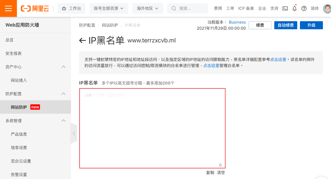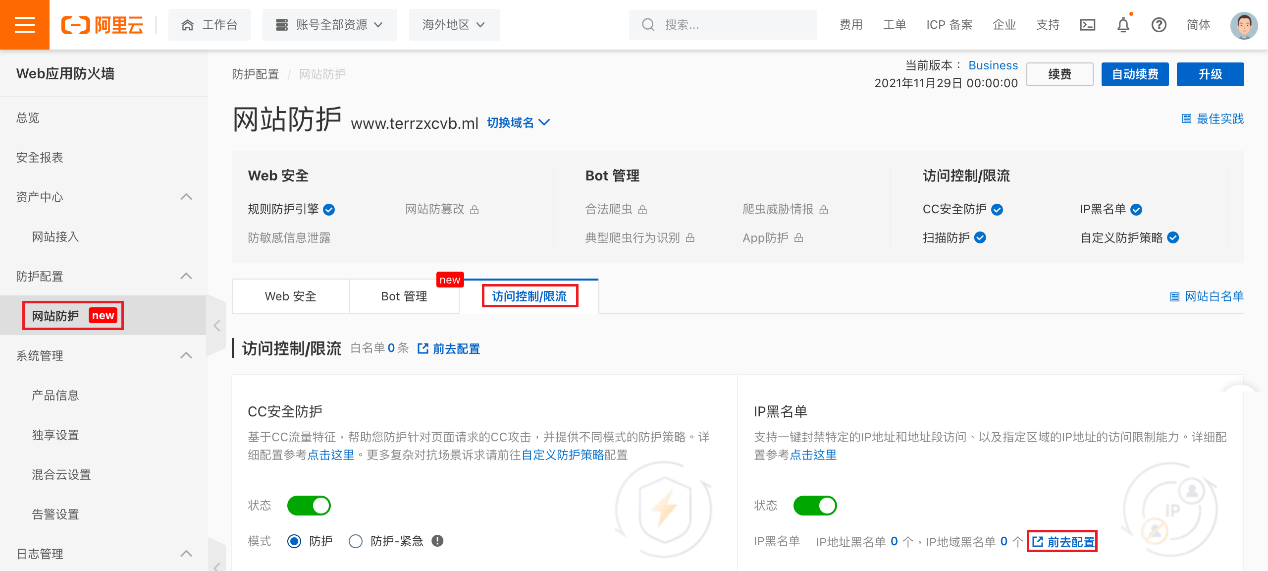 (12) 接下來進行黑名單的設置:選擇網站防護、訪問控制、IP 黑名單的前往配置。
