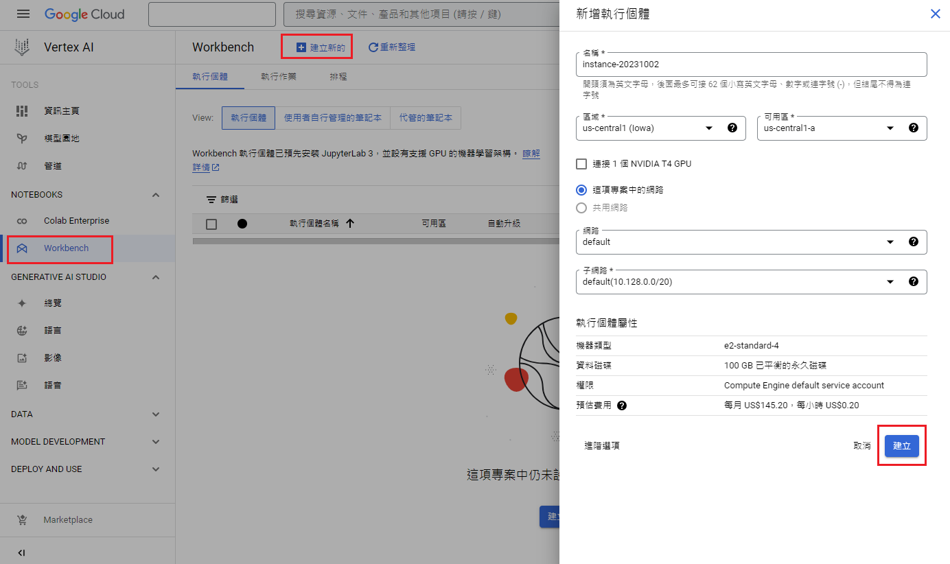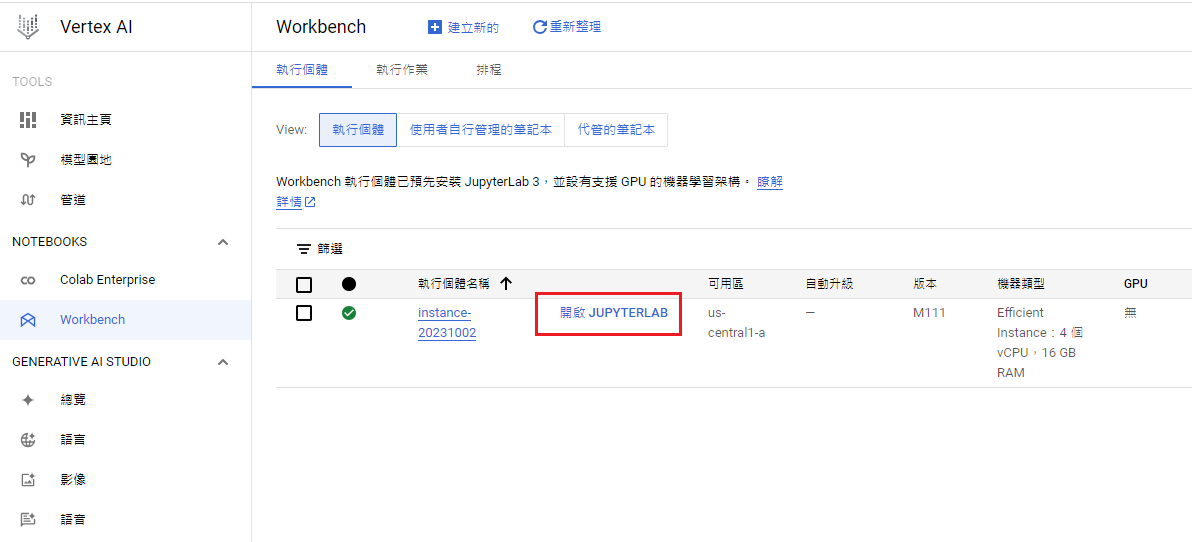 【一】使用Vertex AI左側點選Workbench並建立新的執行個體