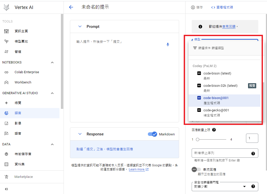 前面的實作中我們這次所使用的模型為 code-bison@001