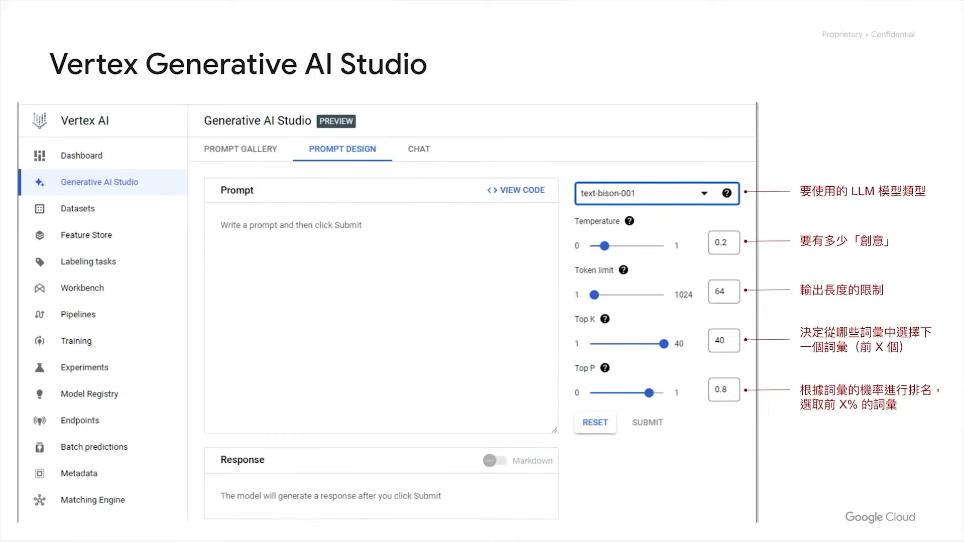 Temperature:是控制生成的文本的創意程度的一個參數。值越高,生成的文本就越有創意。因此若您希望您的 Vertex AI 回覆得更有創意,可以將溫度值調高。