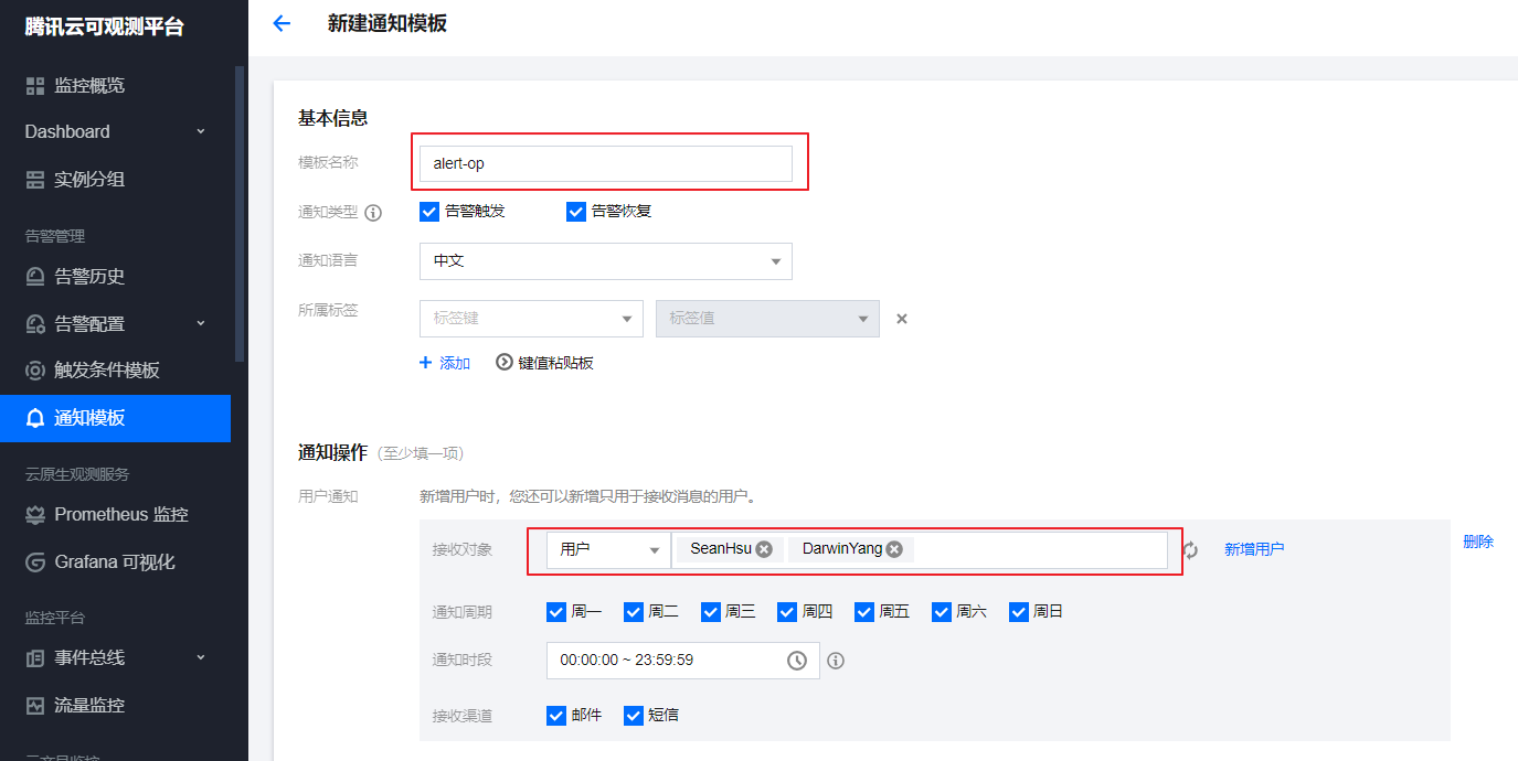 此處請照指示並依需求請輸入相關資訊,以 CDN 監控一案為例,我們期望信件抬頭包含 alert-op 字樣,並配置給 SeanHsu 及DarwinYang (用戶名稱為範例) 隨時可接收到信件,故配置如下圖所示: