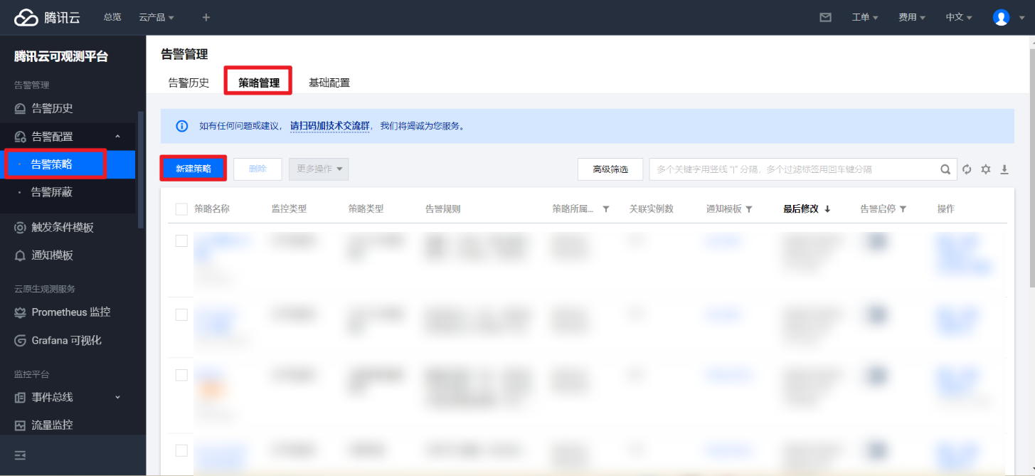 請於左側欄位點選告警策略->策略管理->新建策略。