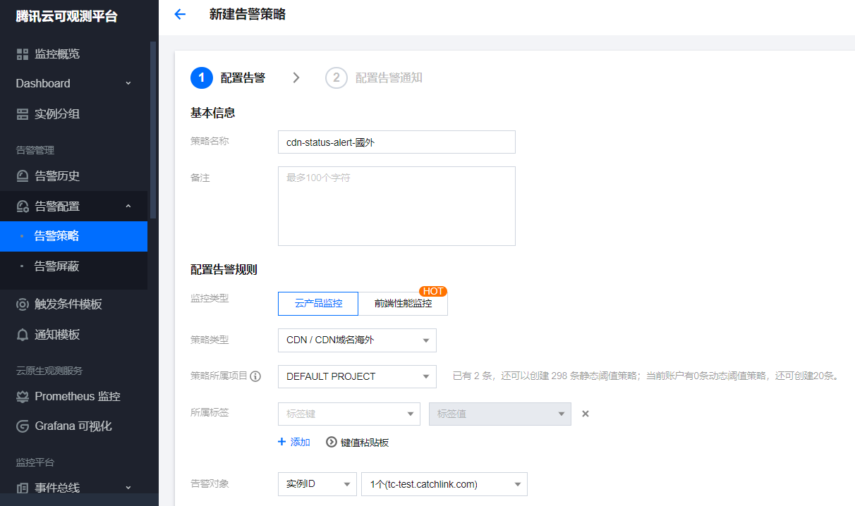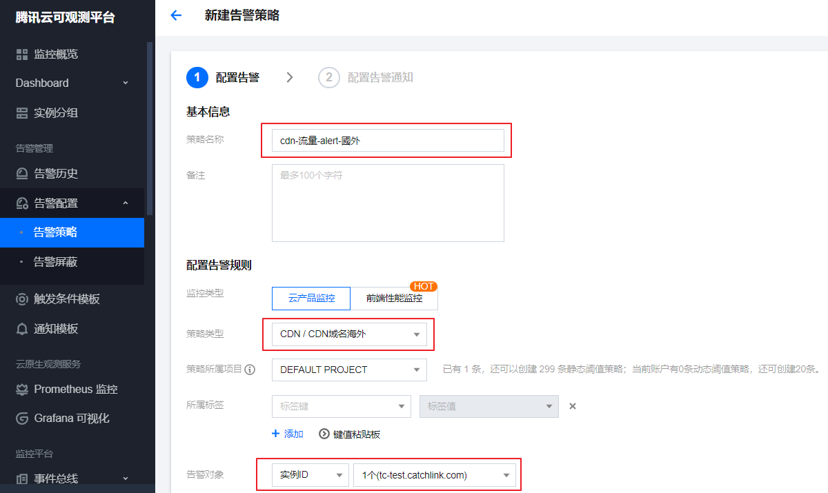 請輸入策略名稱、策略類型(以此案為例,監控標的物為 CDN 服務)、監控對象(例如欲監控的域名)以及監控指標(例如流量 / 頻寛等),如下圖所示: