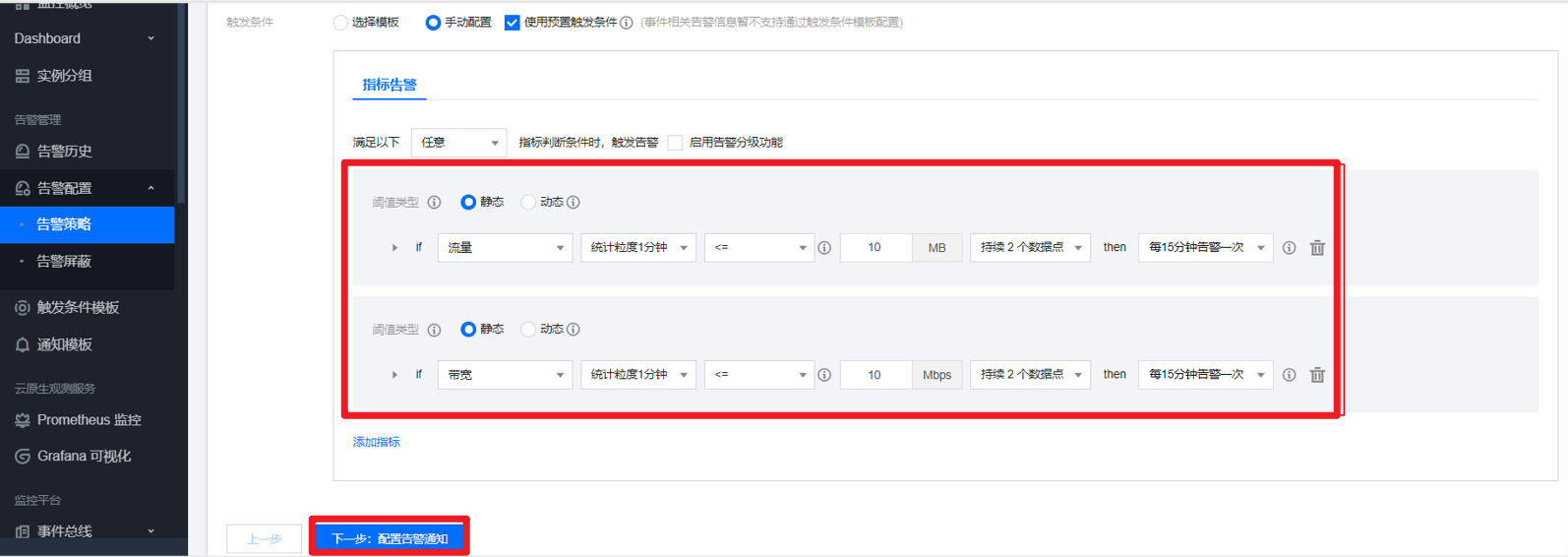 舉例我的服務流量低於 10 GB 以下、帶寬低於 10Mbps 是不正常的,便將指標告警設定如下圖所示: