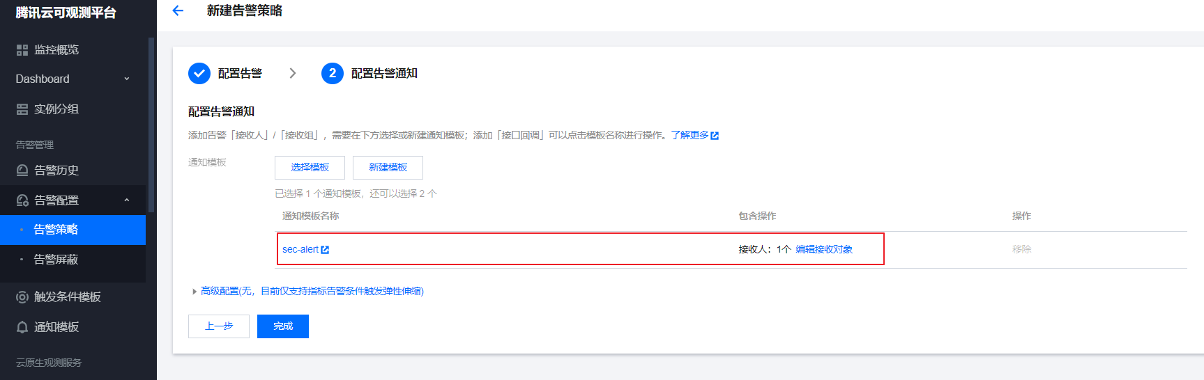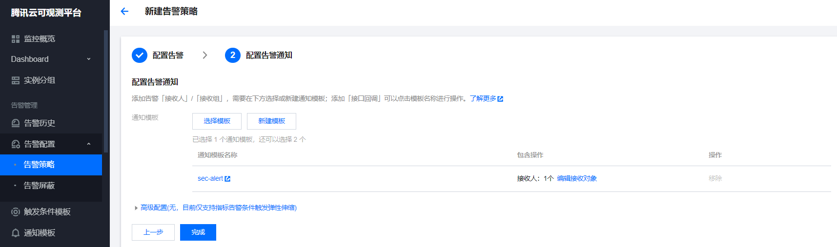 點選 [下一步配置告警通知] 後,請選擇告警通知模板名稱,如下圖所示。