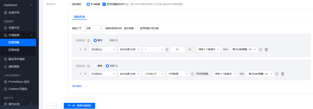 例如當 CDN 訪問 status code 302 或 404 是不正常的狀態,那我們在指標告警的欄位設定以下規則: