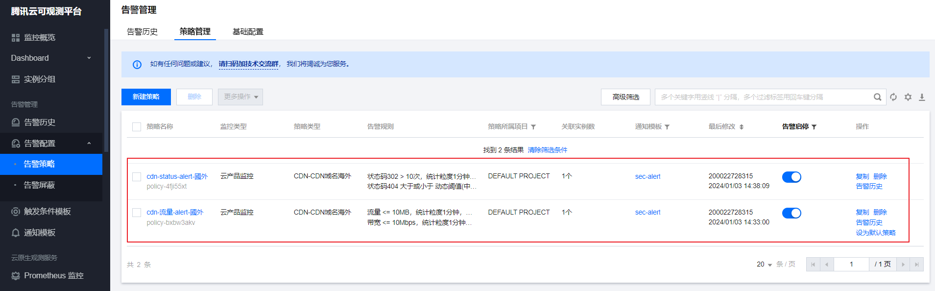 現在,我們已經配置了兩個告警策略,從流量、帶寬、服務狀態碼等面向來監控我們的 CDN 服務!完成可於此處確認告警策略是否配置成功: