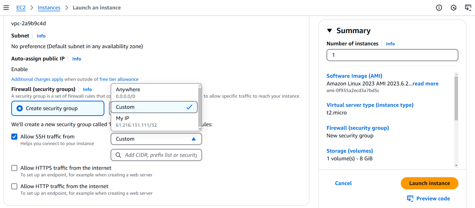 要嚴謹 EC2 允許 SSH 流量來源設定要定義出來源範圍(Custom),不可為 Anywhere 0.0.0.0/0,這代表 Internet 上的任何人都可以遠端 SSH 登入你的雲虛擬機。(見圖一)