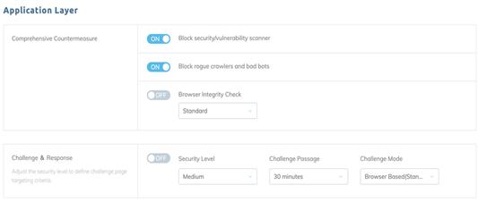 於資安策略部署方面,平台內嵌 WAF 解決方案,因此依預設可於不同的情況下處理各種網路攻擊:設定常見的自訂 IP 和國家黑名單/安全名單、封鎖 CR(盤問與回應)僵屍網路 DDoS 攻擊,並透過不同的條件與模式,靈活保護 Layer 7 防火牆。