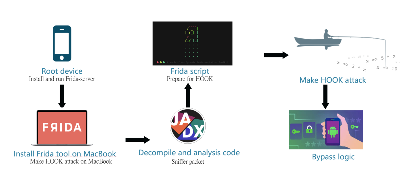 簡單來說: Mobile App在執行的過程中,使用者透過手機螢幕下達指令,但對Mobile App來說是一個程序一個程序(也可稱為事件)接著進行,所以當Mobile App事件傳送到終點前時,可以透過FRIDA截獲並監控事件的傳輸,讓事件到達終點前,像個鉤子鉤上事件,放入一些駭客自己出現的特定事件內容。