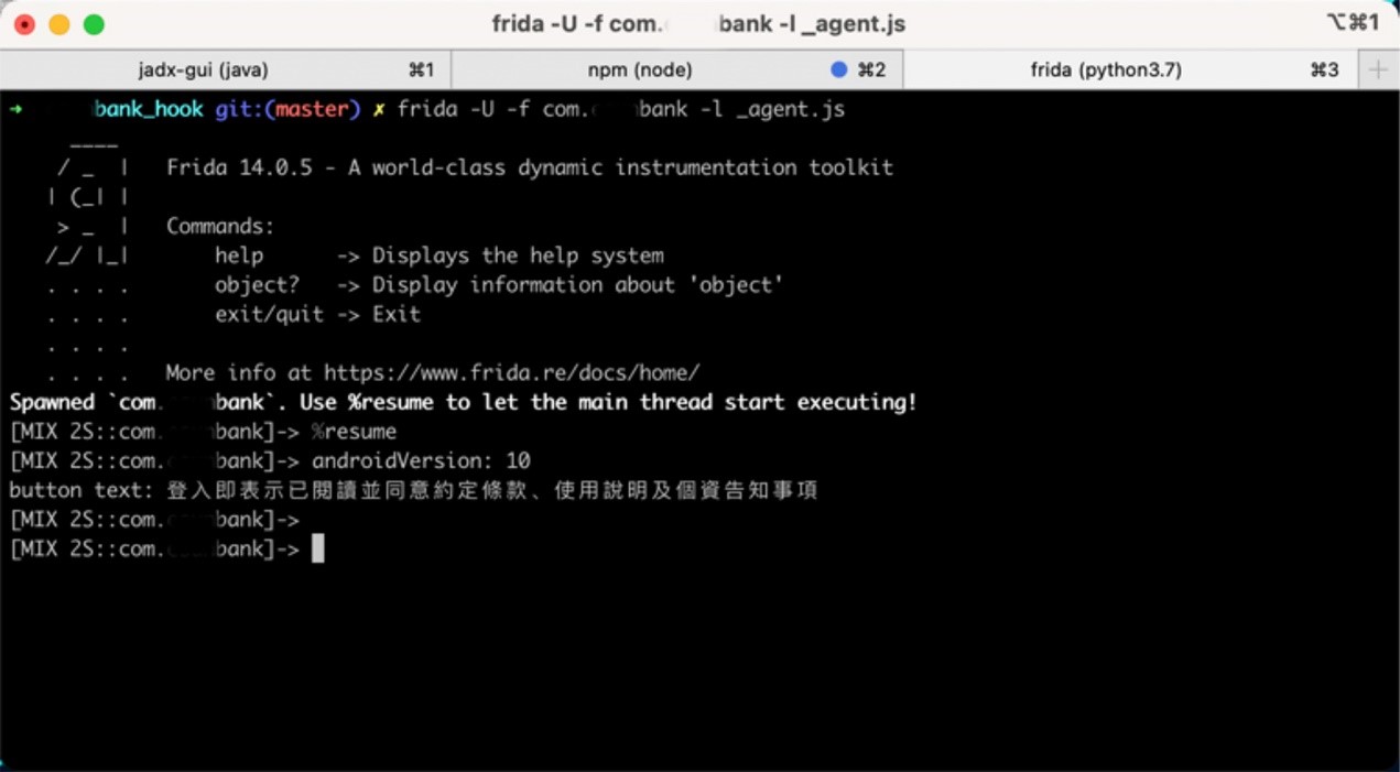由於很多駭客工具只提供解析的內容,讓駭客了解Mobile app的安全狀況,至於能不能修改或攻擊,就要駭客另外處理,無法一邊看解析的內容一邊就進行修改,耗時又耗力。FRIDA在這個部分就非常貼心,提供script模式,只要輸入script指令之後,就可以針對Mobile App進行直覺式的修改。
