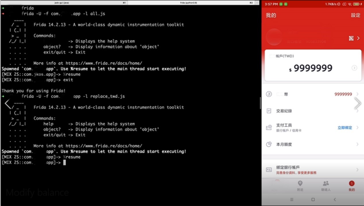 金融網銀App的最大的功能之一就是線上轉帳,假設本來有一筆錢要轉給A,但駭客透過FRIDA的記憶體動態偵錯的功能,充分了解該金融App的觸發事件內容、順序和邏輯,可以在設定轉帳給A的時候,直接在記憶體上把A修改成B,就可以直接將錢轉給指定帳戶。這樣的攻擊方式,就稱為HOOK。
