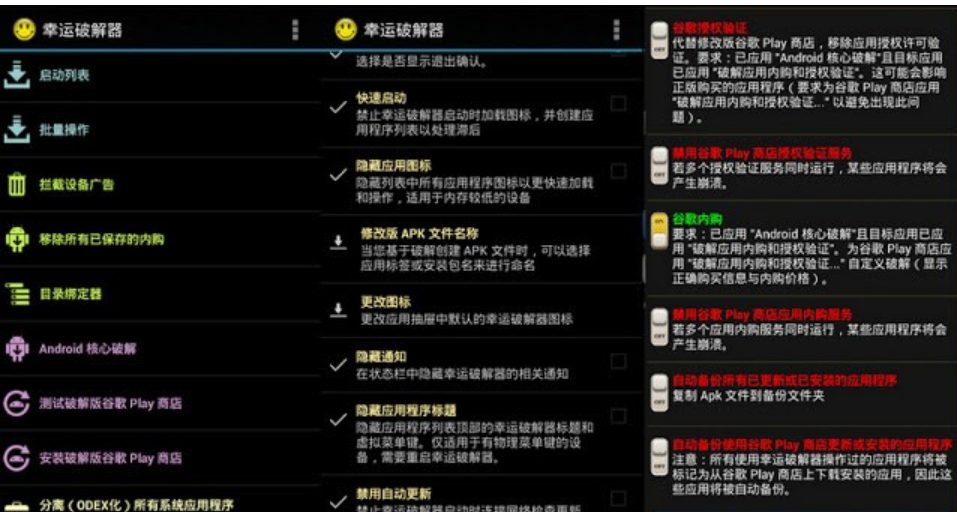 千萬不能因為不保證破解,所以小看它哦,幸運破解器的功能可是非常強大。它可以移除Google授權驗證-支持自動、手動破解和選擇破解方法,並且可移除各種應用中的自定義更新、遊戲廣告,還可更改應用中的程序組件,將修改的ApK文件移至到對應的文件夾。幸運破解器另外還支援,開機自動破解、安裝SuperSU,解決ROOT權限受損問題、支持修復虛擬機緩存和最獨特的橫屏/豎屏切換功能,是一個神級別的破解工具,也讓所有的遊戲公司頭痛不已。