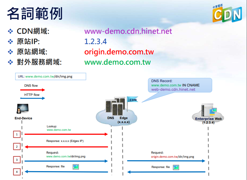 網站內容服務商可將對外服務網域以CNAME指向CDN服務商(即可透過CDN回應用戶的訪問需求),當使用者連上指定網址時,透過DNS解析IP的過程,根據用戶的地理位置解析出對應用戶最近的CDN節點 IP位址,若該CDN節點有存取相對應的原站內容,則可以直接回應給用戶,讓用戶能就近訪問,快速獲取原站內容資訊。
