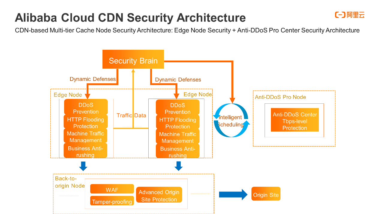 阿里雲運用多年來在防護領域的豐富專業經驗,推出採用邊緣安全防護機制的 Content Delivery Network (CDN) 安全架構,並結合 Anti-DDoS Scrubbing Center 以提供防護;邊緣安全防護機制是建立在分散的 CDN 節點上。