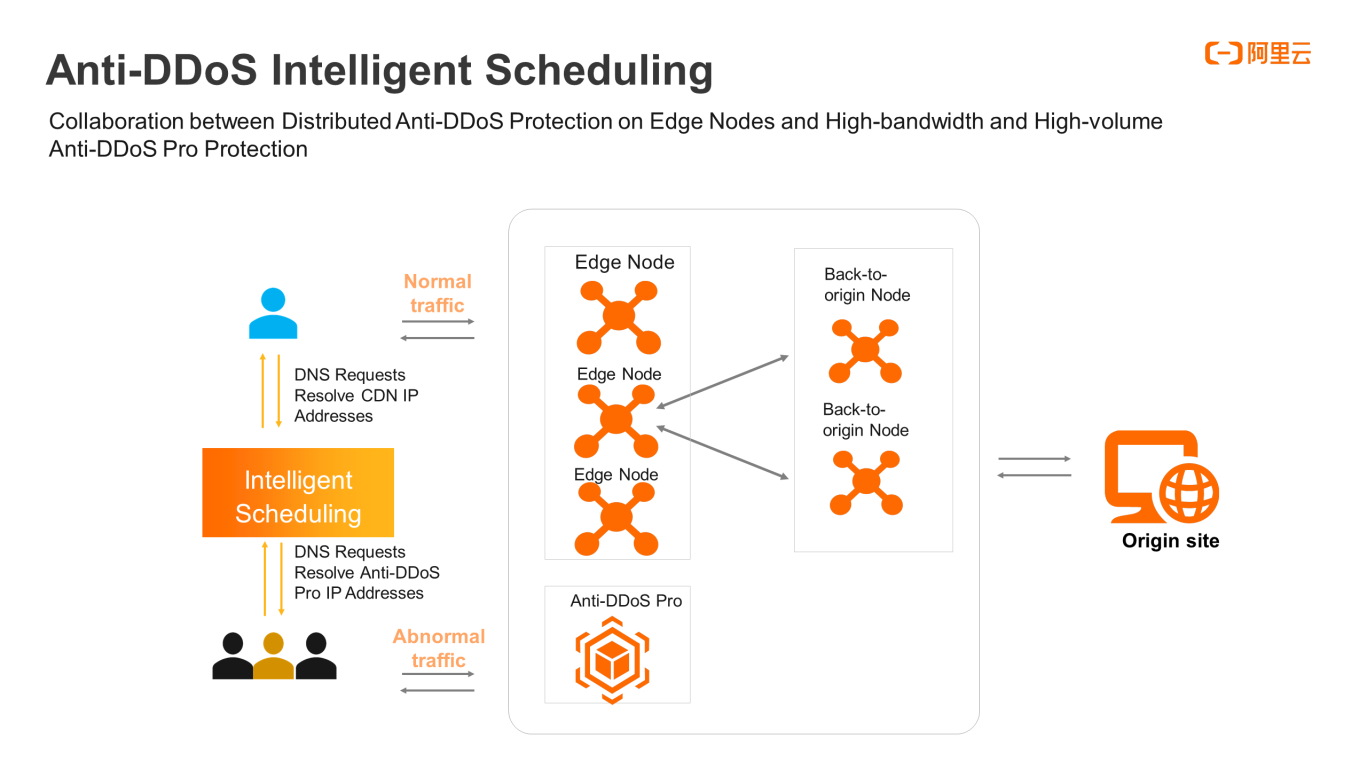 Anti-DDoS 智慧排程的原則是按預設透過 CDN 傳遞業務流量,以獲得最快的速度以及最佳的使用者體驗。當偵測到高頻寬、高容量的 DDoS 攻擊時,智慧排程功能將判定其安全層級,並透過 Anti-DDoS Pro 清洗 DDoS 攻擊。視攻擊的嚴重程度而定,Anti-DDoS Pro 也可執行本機或全域的排程作業。當 DDoS 攻擊停止後,智慧排程會自動將 Anti-DDoS Pro 服務的業務流量傳回 CDN 邊緣節點,以盡量恢復正常加速。