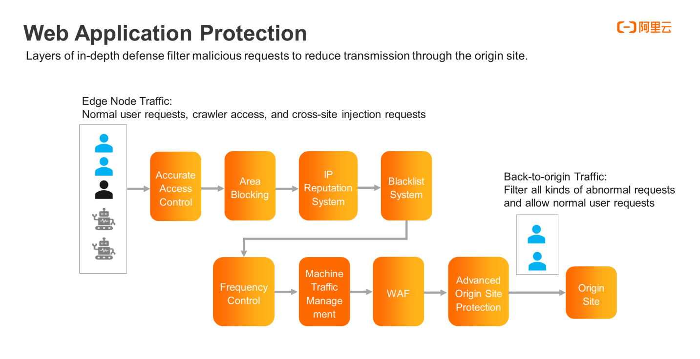 網路攻擊防護政策必須透過層層篩選,以抵禦惡意的請求。第一層為存取控制,指定對 HTTP 請求的攔截政策。第二層是區域封鎖,攔截來自無效或異常區域的請求。第三層是 IP 信譽系統,可歸類惡意行為並透過阿里雲多年來累計的網際網路 IP 位址大數據資料檔攔截 IP 位址。第四層是黑名單,攔截特定的 UA 或 IP 位址。上述四層都採用精準攔截。第五層是頻率控制,攔截相對異常高頻率的 IP 位址。第六層則管理網際網路上的機器流量,並封鎖惡意的爬蟲程式。第七和第八層為原始站點提供 WAF 與進階防護。