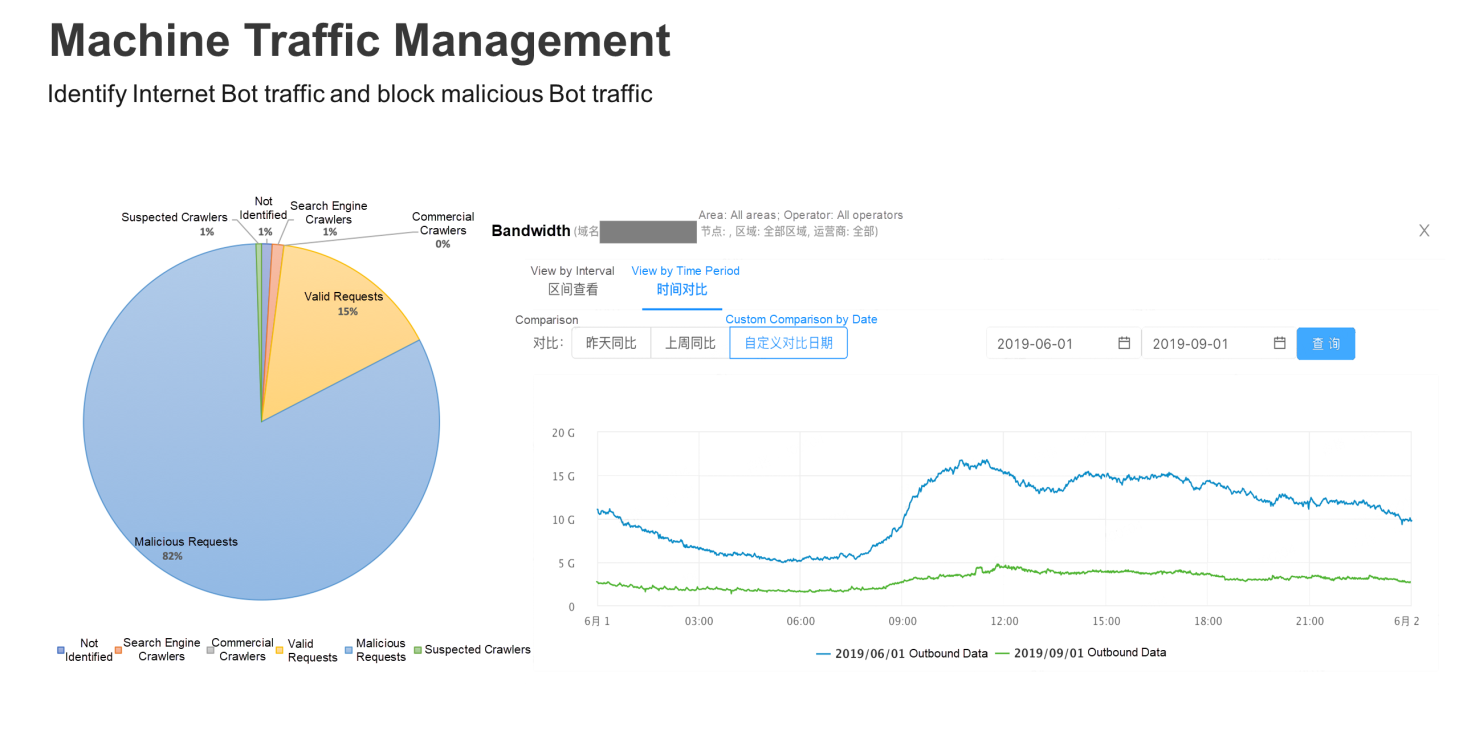下圖顯示一個使用案例。首先,實施機器流量管理政策後,前往某網域名稱的流量會受到分析。左方的圓餅圖顯示的場景為,某網域名稱啟用機器流量分析後,發現超過 82% 的請求都來自惡意的爬蟲程式。右方的圖表顯示,啟用機器流量的惡意爬蟲流量攔截功能後,該網域名稱的尖峰頻寬減少了 80% 以上。