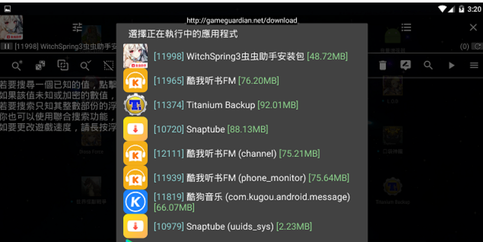 GameGuardian偵測到記憶體上所有執行的App,只要透過直覺式的頁面(記憶體上正在Run的遊戲App),選擇要修改的App就可以進行快速修改。