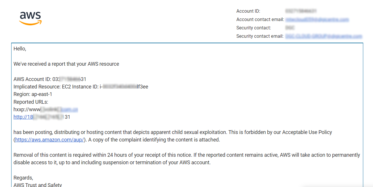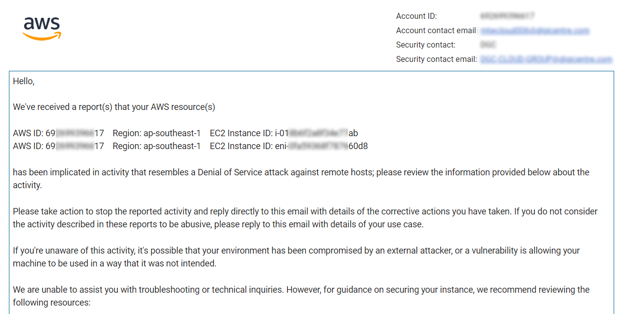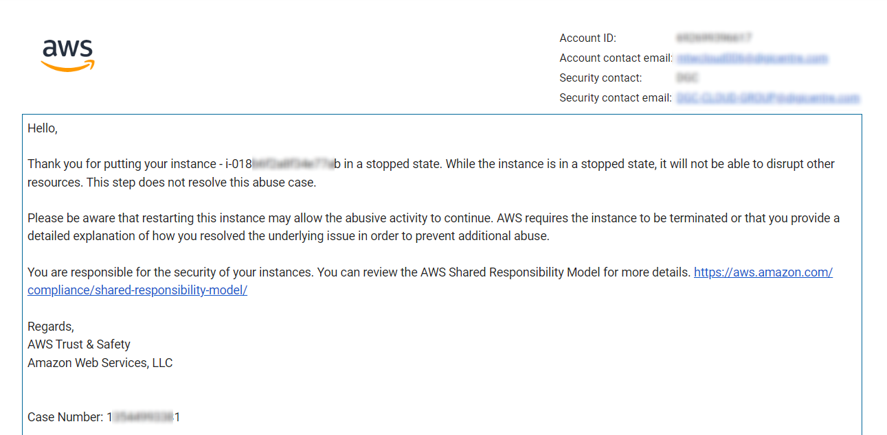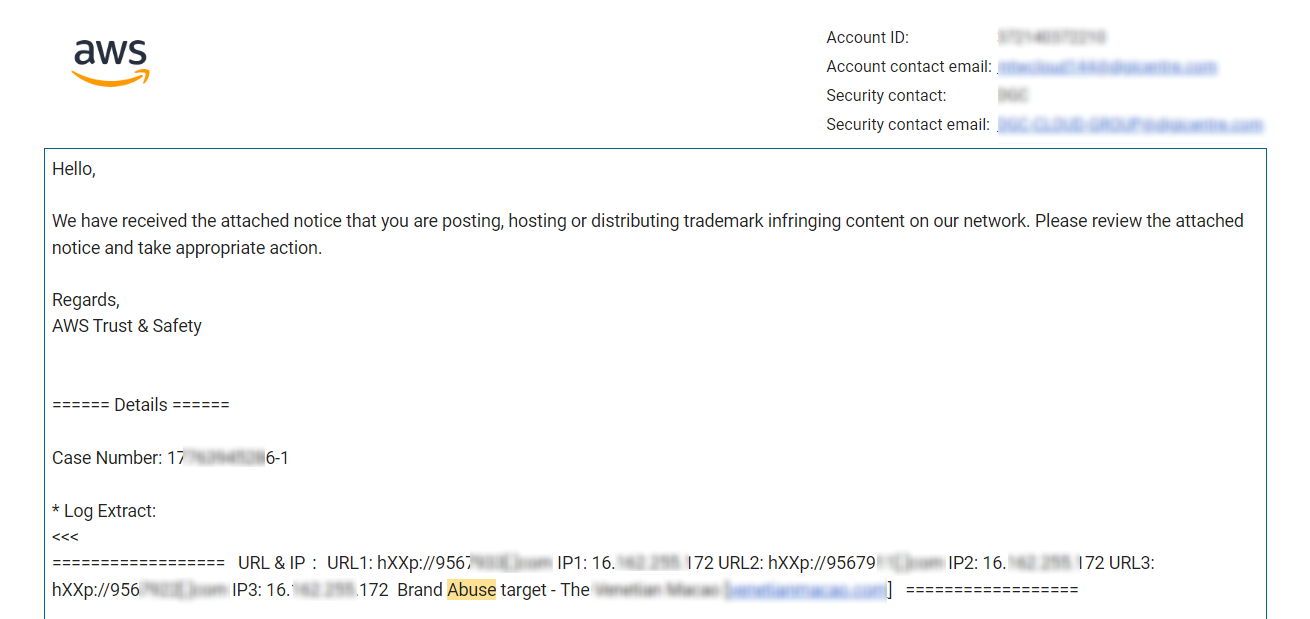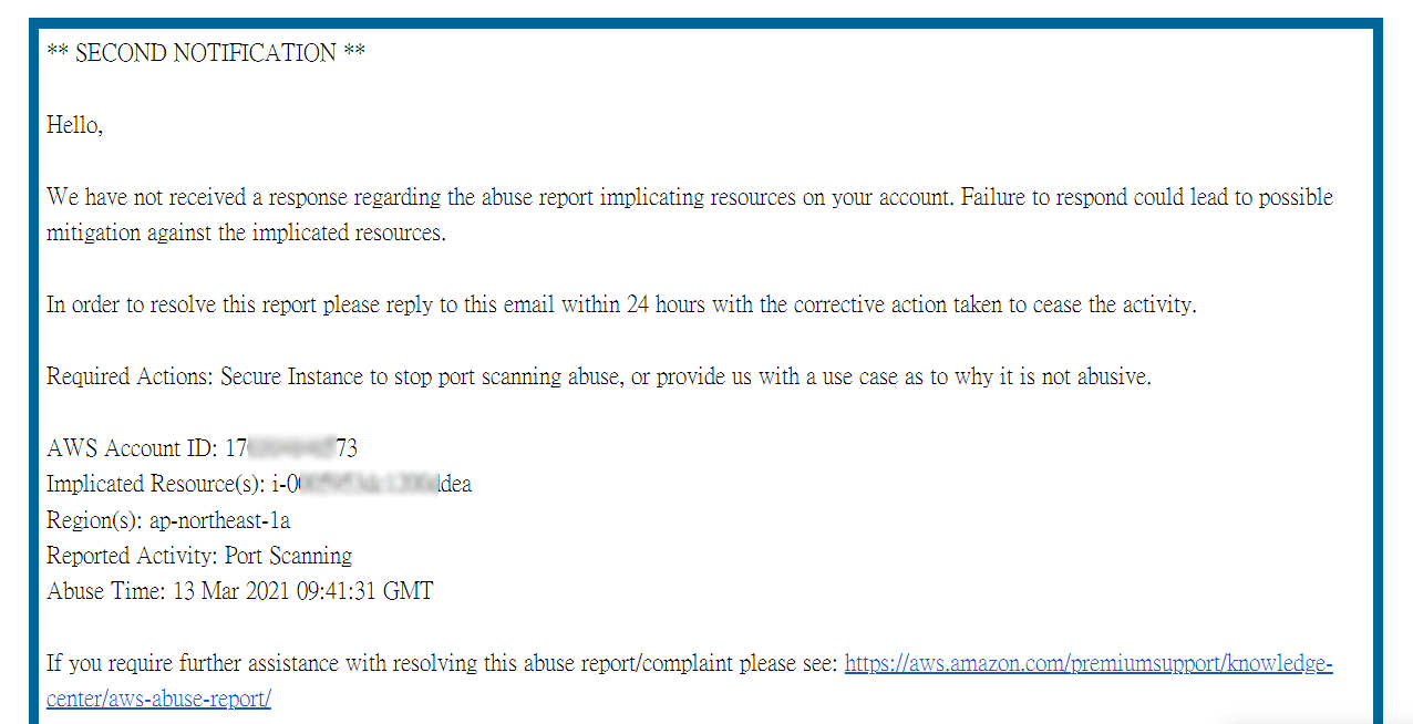信件標題通常為” Your AWS Abuse Report [Case Number] [AWS ID]