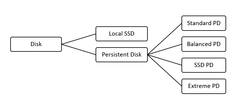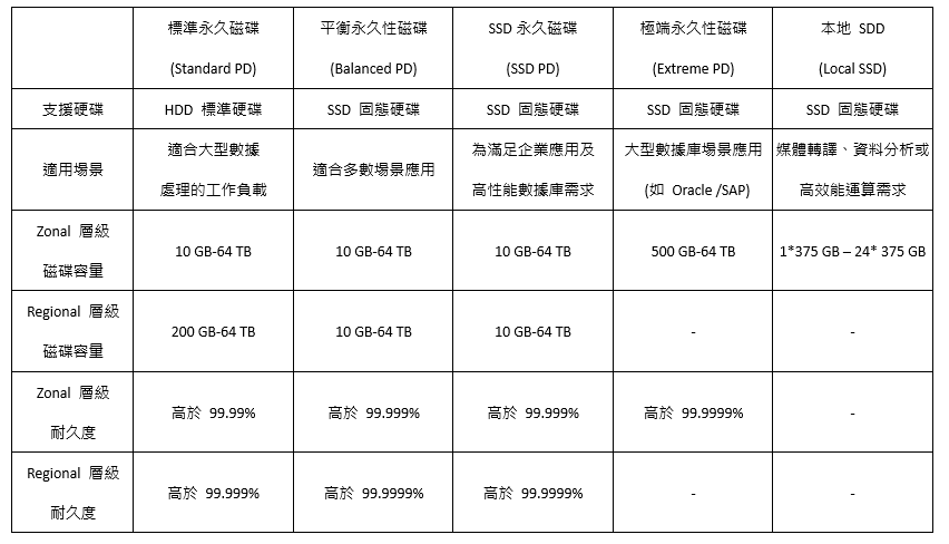 Persistent Disk 又依據性能分為以下幾種:Standard PD(標準永久磁碟)、Balanced PD(平衡永久性磁碟)、SSD PD(SSD永久磁碟)及 Extreme PD(極端永久性磁碟)。