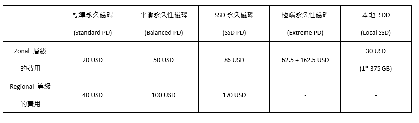 如皆以 Zonal 層級為比較對象,費用從低到高為Standard PD < Balanced PD < SSD < Extreme PD。